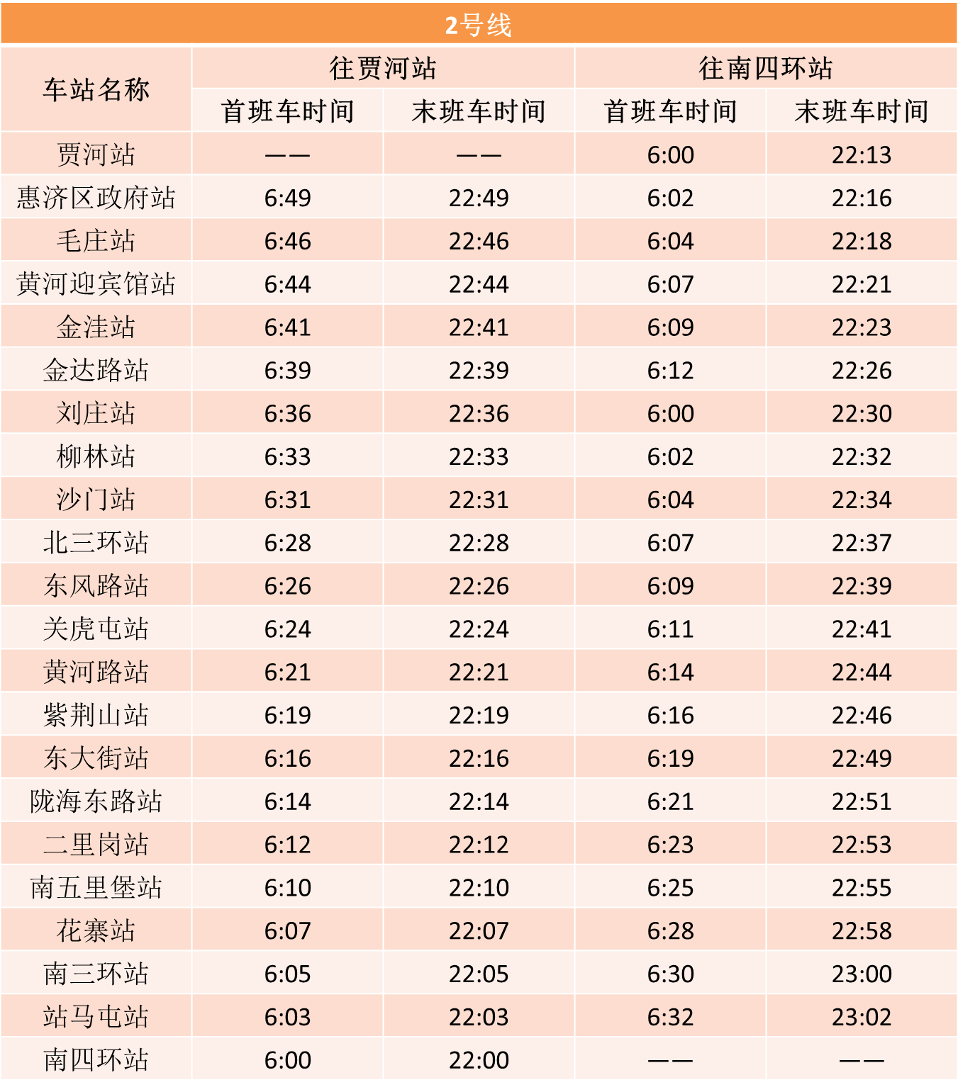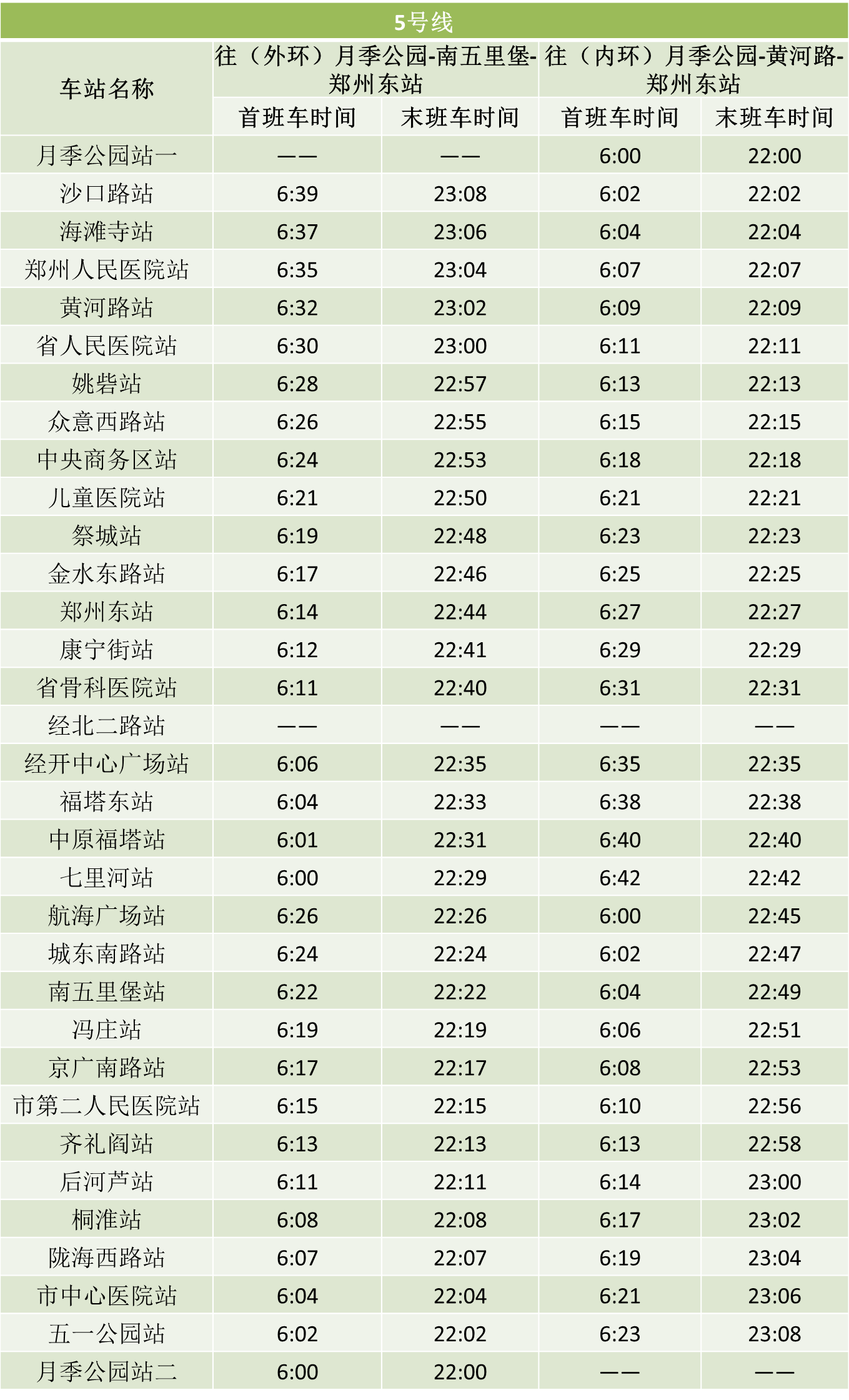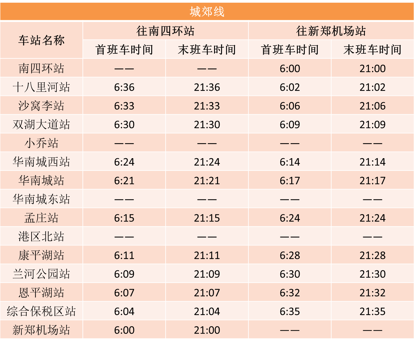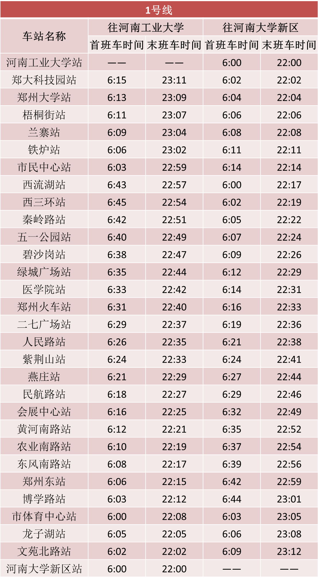 鄭州市發(fā)布最新通告,自2020年3月9日零時(shí)起,恢復(fù)機(jī)動(dòng)車(chē)限行。結(jié)合復(fù)工復(fù)產(chǎn)后逐步回升的客流情況,在嚴(yán)格做好疫情防控工作前提下,鄭州地鐵自3月9日起將調(diào)整全線(xiàn)網(wǎng)行車(chē)間隔。1號(hào)線(xiàn)、2號(hào)線(xiàn)、5號(hào)線(xiàn)行車(chē)間隔壓縮至高峰期8分鐘以?xún)?nèi),城郊線(xiàn)行車(chē)間隔壓縮至高峰期16分鐘以?xún)?nèi),14號(hào)線(xiàn)一期暫不恢復(fù)運(yùn)營(yíng)。線(xiàn)網(wǎng)已開(kāi)通車(chē)站首末班車(chē)時(shí)刻表如下: